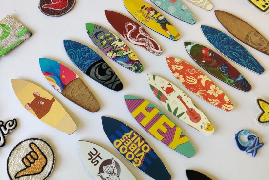 The materials used for making the mini surfboards are plywood, thick mount board and acrylic sheets. The designs were laser engraved and on some we stuck a few stickers to add colorful graphic elements.